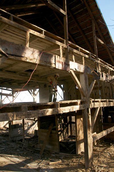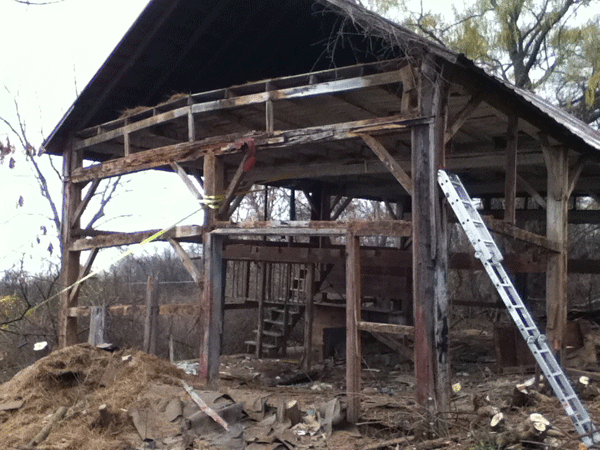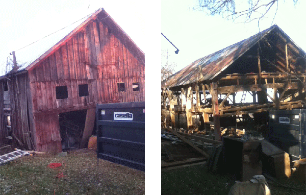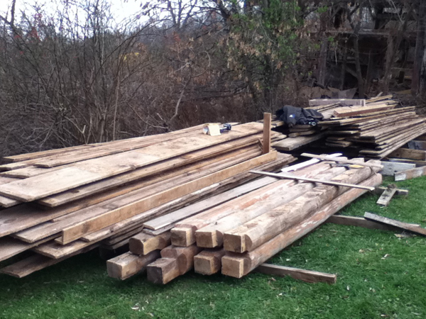 Barn Salvage OperationJuly 2012 => Ithaca, NY This fine barn was built in the middle of the 1800s just west of Ithaca, NY. Sometime in the 1980s, the barn developed a lean. With a tight roof and good siding, most of the wood inside remained in good shape -- but the structural problems meant that the days of this barn were numbered. Tools
