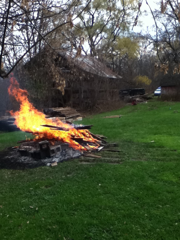 Barn from the Air The Salvage OperationThis barn was built with (real dimensions) 3x5" roof members, wide (20"+) oak floor boards, and the usual hand-hewn beams. It turns out one-or-two people can take down a barn of this size in about five days. Lacking a crane or cherry-picker, we left the roof intact. We started with the siding to provide light, then took up the floors. After that, we took down as much of the frame as possible before pulling it over. Day 1 Before-and-After Day 2 Before-and-After, 2nd Floor Joinery Example Day 3We burned broken pieces of siding and other wood we wouldn't be able to use. And then made stacks of the salvaged barn wood. Day 4 Before-and-After DemoPulling over the barn involved two simple tools: straps and a come-a-long. site created 7.2012 by spencer |